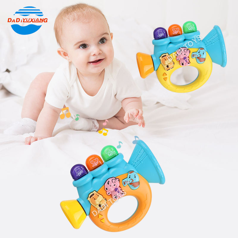The toy features 3 buttons inside that play different songs and 3 animal-shaped keys on top that emit sounds corresponding to the chosen animal, complete with blinking lights. The Change-Over button plays 4 different songs and also changes the songs of the 3 animal keys. Easy to use, made from high-quality, durable, and safe materials, this Musical Trumpet Toy requires 3 AA batteries (not included).